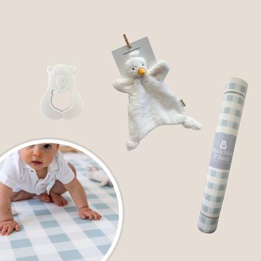 This gift Bundle has the perfect combination of a play mat and two gorgeous baby toys. Included is a super squishy medium sized 'Gingham' design play mat, plus the cutest 'Buster the Bear' teether toy (in beige) as well as one of our new Softie toys. 'Puddles the Duck' plush toy is the ultimate comforter with a soft rattle in its beak.