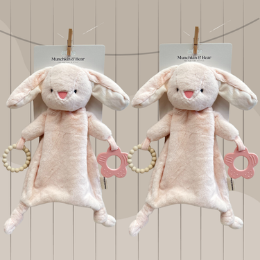 'Coco' the Bunny  (with built in SENSORY TEETHERS) is made from super plush fabric, designed for snuggling and hugging tight! 'Coco' is the cutest pink rabbit that loves to be held, stroked and loved, she likes being taken everywhere and is great as a self-soothing aid. 'Coco' is holding two soft pink teethers for extra interaction.